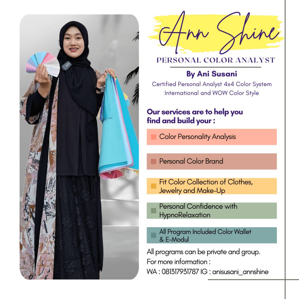 Sebuah kebanggaan bisa menjadi seorang Personal Color Analyst. Berawal dari kecintaan Saya terhadap fashion, Saya menyadari banyak di antara kita yang seringkali mengalami kebingungan ketika harus memilih dan mencocokkan atau padu padan mulai dari baju, sepatu, warna rambut, kacamata, perhiasan, tas, make-up dan lain-lain.