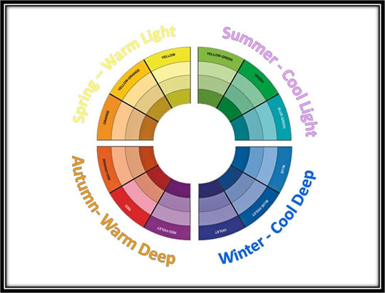 Analisis warna konvensional didasarkan pada empat musim/kelompok. Musim gugur (hangat & dalam) gelap dan berapi-api, musim dingin (sejuk & Dalam) memiliki warna gelap dan terang dengan kontras yang tajam, dan musim semi (hangat & terang) mewakili pertumbuhan dan memiliki warna-warna cerah sedangkan musim panas (sejuk & terang) memiliki warna sejuk dan lembut warna tenang yang mencerminkan kehidupan penuh. Ide ini telah menjadi dasar teori warna selama bertahun-tahun, yang mengarah pada berbagai mode, tata rias, dan efek berdasarkan musim/kelompok.